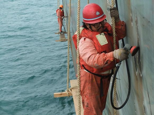 长航成功轮精心组织船舶维护保养,努力保持船容船貌整洁。图为该轮1月16日,农历龙年腊月二十三小年,利用在海南洋浦抛锚时间,大副曾新强和水手长鲁临保组织带领甲板部船员搭跳板加班加点进行船壳外部除锈油漆工作。(张诗强)