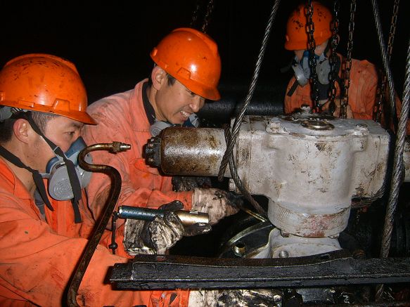 图为大庆455轮船员们在航行途中抢修货油阀,保障船舶安全。(徐刚岸)