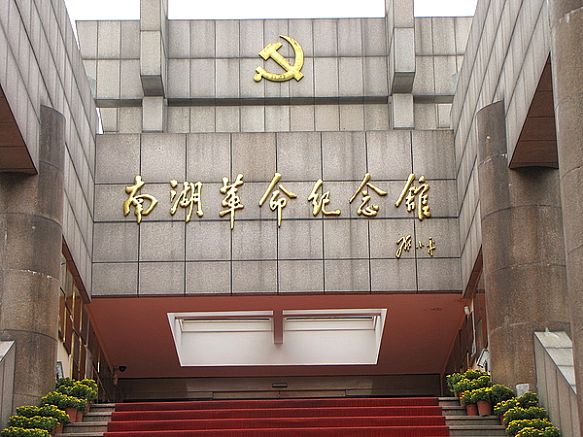 我先介绍一下整个南湖纪念馆新馆给我的印象,新馆坐落在嘉兴的西广场中心,它靠近原来南湖的南侧,老馆在南湖的东侧,占地面积2.73公顷,由“一主两副”三幢建筑组成。整个纪念馆从正面看上去像一个“工”字形,气势比较宏伟,风格庄重大气且具江南水乡韵味,远看很像北京的人民大会堂,兼有世博中国管设计风味。整个南湖革命纪念馆的新馆除了图片、文字这些传统的展陈手法之外,更多地运用了雕塑、场景、油画、三维立体影像、多媒体系统、触摸屏等新手法,这些声光电等高科技的完美结合,让多年前的历史生动地展现在世人面前。举个例子,比如说走进主楼大厅,展厅中间是圆形的视厅,头顶上有一个巨大的圆形投影的屏,随着投影仪的不断变化,就会出现乌云密布,耳边也会炮声阵阵,辛亥革命、五四运动等等重大事件的模拟场景就会交替出现在参观者的眼前,最后,所有的目光都集中到了一只“破墙而出的红船”上。位于大厅一楼的浮雕采用了高浮雕手法,这种形式在国内是比较罕见的。浮雕部分与基面相距30厘米,尤其是“红船”,其突出部分离基面有1米多,艺术地再现了“石破天惊”的场景。