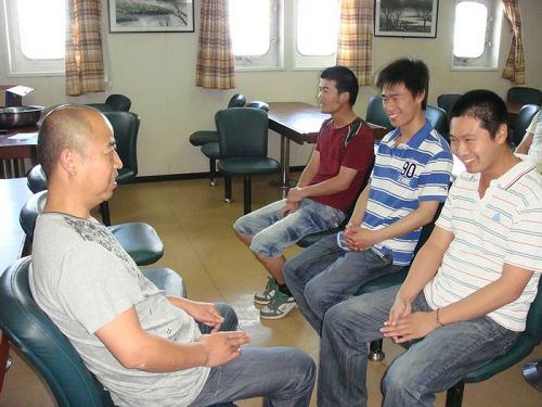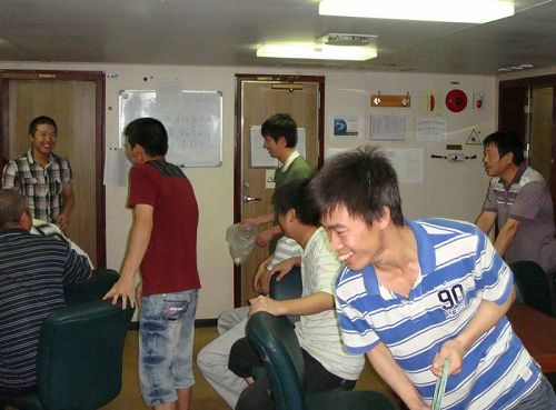 为鼓励青年员工勇于用英文对话,善于对话,该轮党支部与工会组织甲板部水手进行了一次英语口语比赛。该项比赛根据船舶日常工作中常会遇到的情境,如货物操作、驾驶台联系,与检查官、码头长、商检、引水、供应商的交流等场景,由船长孟善春与每一位水手进行模拟对话,并根据回答的准确性、熟练程度和英语语感进行综合评判。最后,水手林琦、实习三副徐国梁以及外租水手杜峰分获一、二、三名。