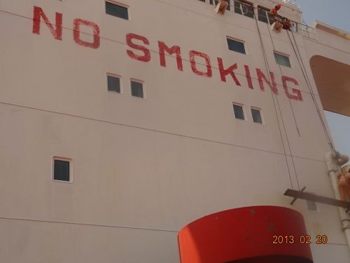 长江之光轮是一艘有着4年船龄的VLCC,该轮由于以前锚泊时间较少,船尾尾楼尤其是窗户无法保养,窗沿锈蚀严重,严重影响船舶外观。该轮船员利用本次在FUJAIRAH OPL锚泊等计划的有利时间,将4年来平时无法保养的尾楼进行除锈油漆。图为船舶维护保养现场。(张国华)