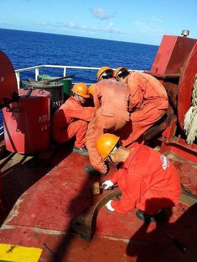 长航飞跃轮坚持以安全生产为主线,在加大了设备自查整改力度的同时,加强设备维护保养,确保了设备运转的可靠性。近日,长航飞跃轮甲板部在自查时,发现船尾左绞缆机刹车带装置因刹车带长期磨损,加上相关部位锈蚀活络不畅,已无法满足靠泊带缆的需求。鉴于此,该轮大副张培相立即组织人员解体该装置进行更换刹车带及活络作业,确保船舶在抵达下一港之前,恢复设备的良好工况。图为航行在赤道附近的长航飞跃轮甲板部人员,冒着甲板四十多度的高温,更换刹车带作业的场景。(刘树森)