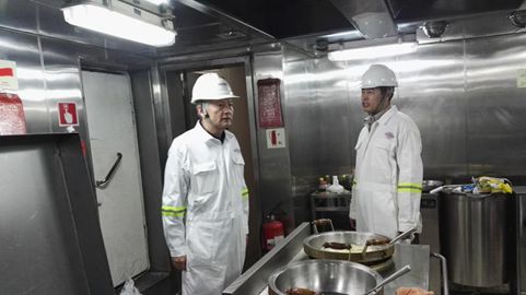 李万锦分别到船舶甲板、货控室、餐厅等单元进行了检查,并和在船船员进行了座谈,简要通报了集团航筹办特殊时期安全工作要求、公司2017年生产经营绩效以及近期安全形势等情况,详细询问了船舶安全管理、船员思想和节日安排等情况,特别是就劳动安全、体系执行以及节日期间烟酒管制等提出具体要求。
