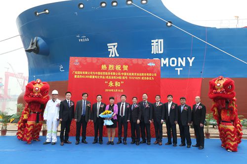 3月15日上午,广船国际龙穴造船基地交船码头上,锣鼓喧天,金狮狂舞。长航油运光租新造的4艘49999DWT化学品/成品油轮之“永和”轮命名交船仪式正在举行。这是继去年12月5日“永荣”轮之后,广船国际交付的第二艘新型5万吨级油化两用型船。
