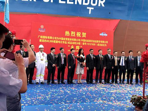 2018年4月28日上午,招商局集团下属经贸船务投资、长航油运监造并光租、广船国际承建的五万吨油化两用船3号船在广州龙穴岛举行命名仪式。招商局集团董事、招商轮船董事长、长航油运董事长苏新刚参加仪式并致辞,长航油运董事张保良,中国船务总经理、长航油运监事会主席徐挺惠,长航油运董事总经理周斌,中船贸易亚太部郑民胜副经理,广船国际董事长兼党委书记韩广德、副总经理欧传杰,CCS广州分社副总经理陈林龙等20多位嘉宾共同见证了这一激动人心的时刻。