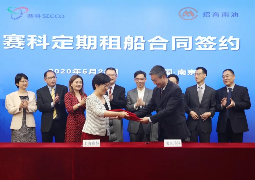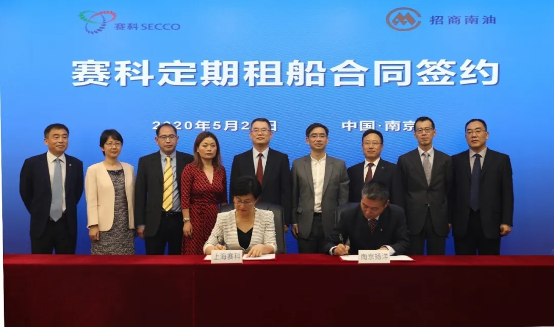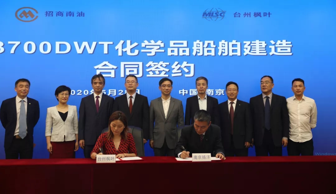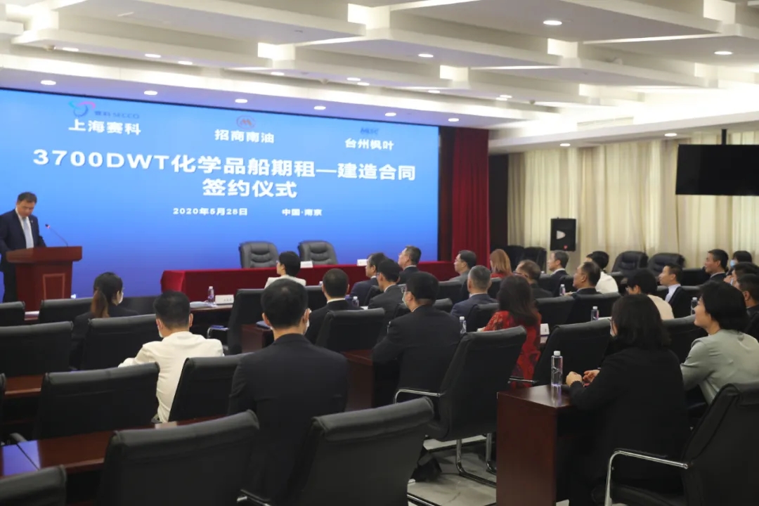 2020年5月28日下午, 乘着两会胜利闭幕的东风,上海赛科、南京扬洋、台州枫叶船厂3700载重吨化学品船舶期租-建造合同签约仪式在南京油运大厦顺利举行。