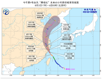 今年7月西北太平洋没有台风生成,也没有台风在中国沿海登陆,这在历史上属首次。8月1日晚,台湾东南洋面热带低压加强并成为今年第4号台风“黑格比”。该台风发展迅速,中心风力强,影响区域广,8月4日凌晨4点在浙江乐清登陆时中心最大风力达13级,并于8月5日早晨在江苏盐城再次入海,最后从黄海登陆朝鲜半岛。